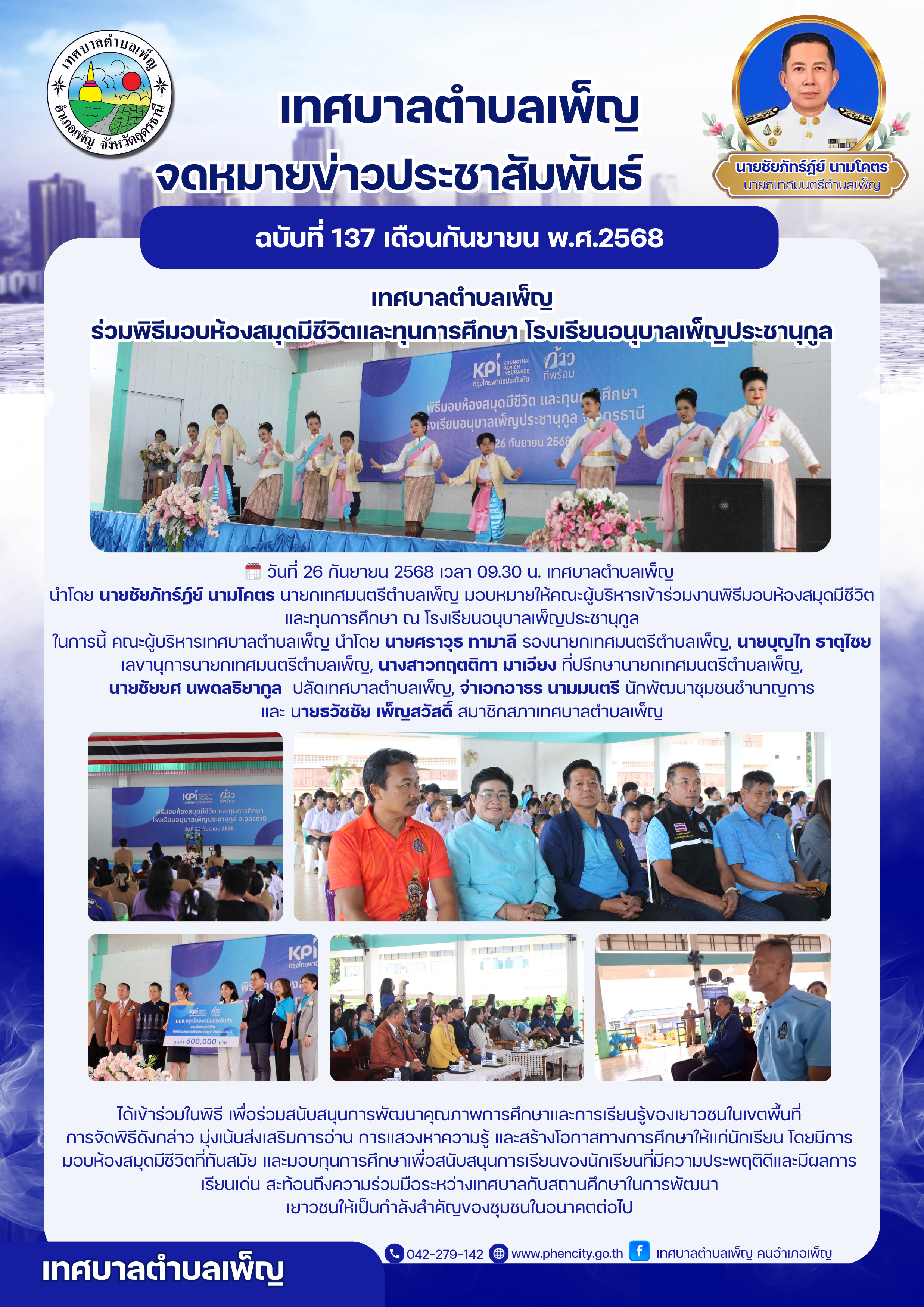 เทศบาลตำบลเพ็ญ ร่วมพิธีมอบห้องสมุดมีชีวิตและทุนการศึกษา โรงเรียนอนุบาลเพ็ญประชานุกูล